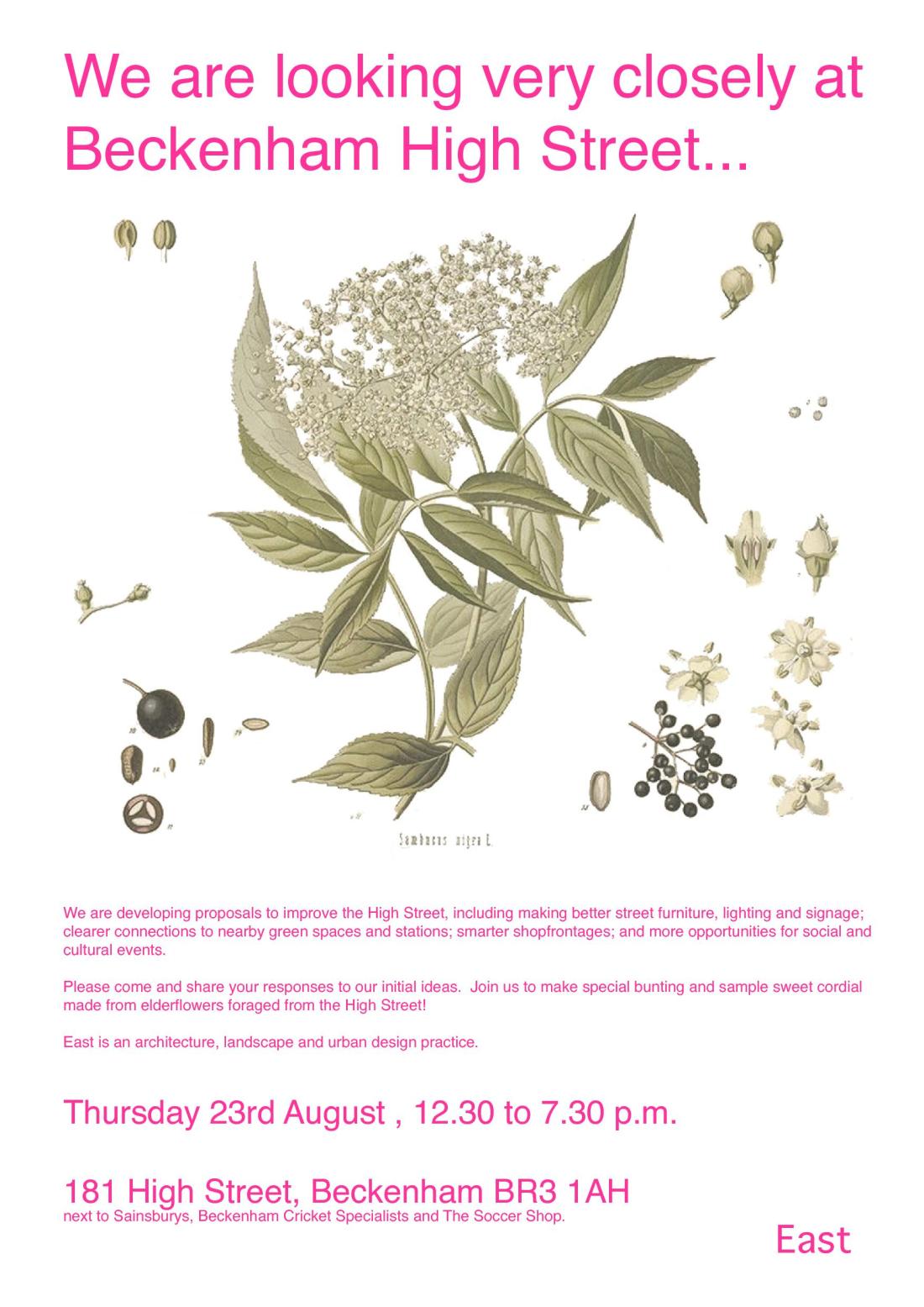 East (architecture, landscape and urban design practice) was hired byBromley Council to create a design concept for the regeneration of Beckenham Town Centre. East invite Beckenham residents and businesses to view the plans. Why not pop along to 181 High Street, Beckenham BR3 1AH (next to Sainsburys, Beckenham Cricket Specialists and The Soccer Shop) between 12.30 to 7.30 p.m. on Thursday 23rd August.