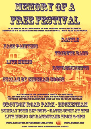 Sunday afternoon in Croydon Road Recreation Ground, a local park in Beckenham, the residential south of London may not conjure up visions of youthful exuberance and rock music – but on Sunday September 15th the Friends of Croydon Road Recreation Ground are hoping that hundreds of people will descend on their park to celebrate David Bowie – Beckenham’s most famous former Beckenham resident, the legacy of the Arts Laboratory he co-founded, and the sensational Free Festival that Arts Lab members staged on the Bandstand in the park in 1969.