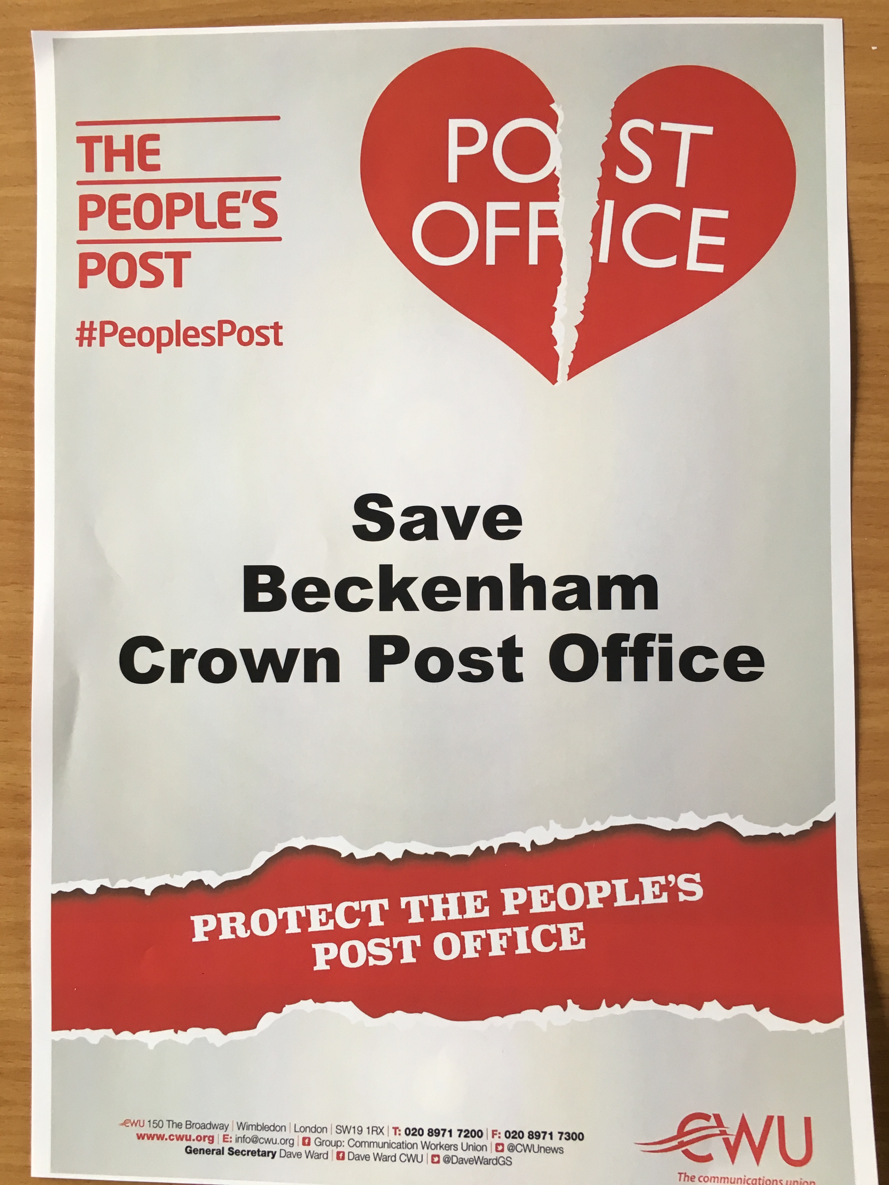 The Post Office are planning to close 42 branches across the country in 2016, Beckenham is one of the Post Offices on the hit list. The Post Office will offer up franchises nearby to replace most Crown Post Offices closed. Local people and the Post Office Workers Union (CWU) are fighting to retain the Crown Post Office in Beckenham for the following reasons: