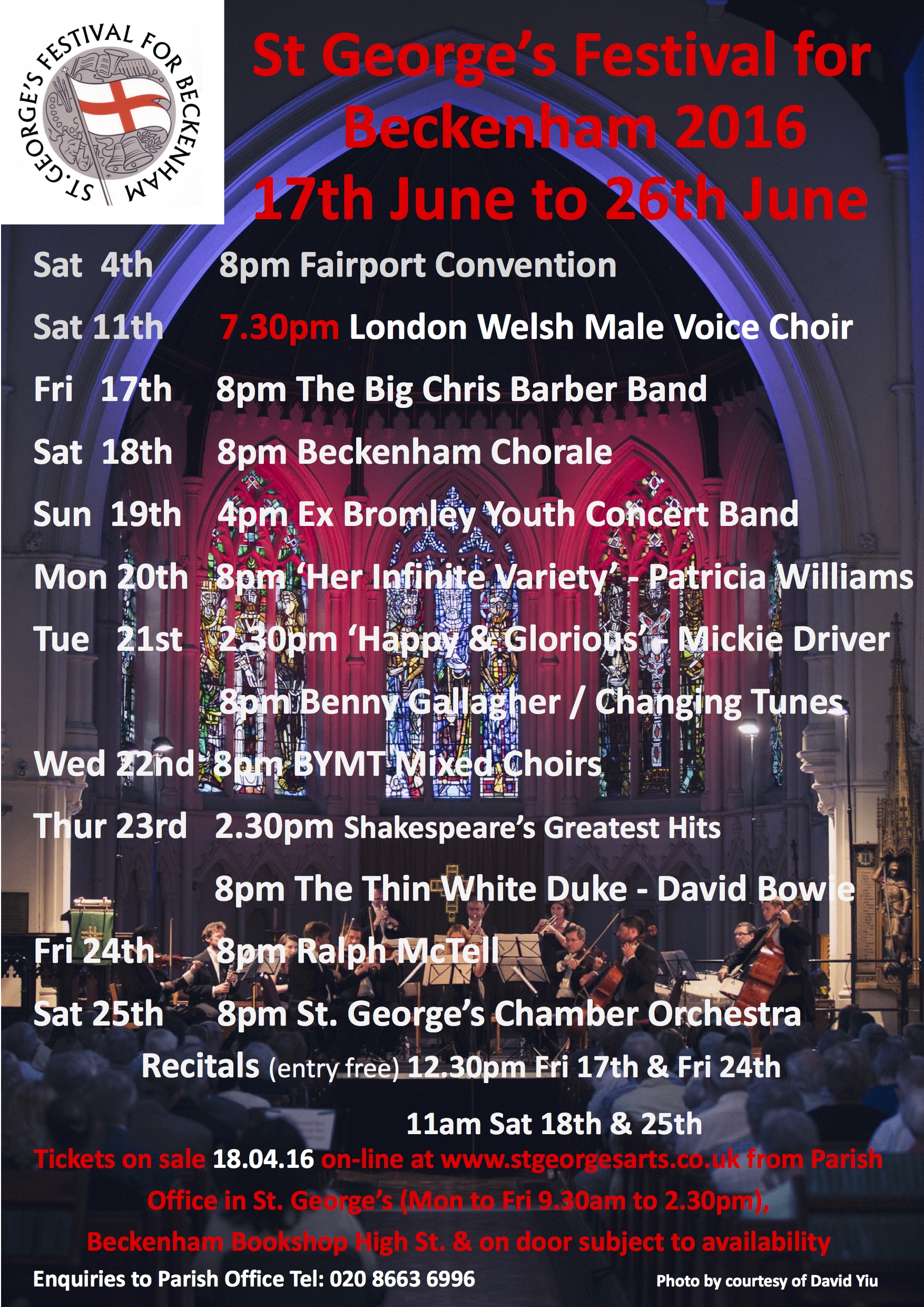 St George’s Festival for Beckenham 2016 – Friday 17th to Sunday 26th June with two warm ups 4th June Fairport Convention 11th June London Welsh Male Voice Choir