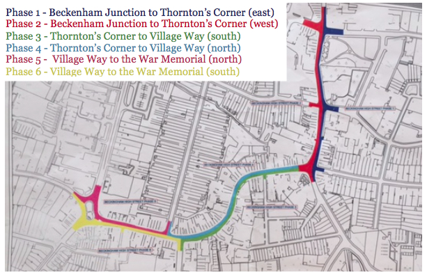 Works at Beckenham Junction are due to finish tomorrow Sunday 12 March 2017. Work will then start on Phases’ 1 and 2 of the Town Centre Improvement Project. This will run from Beckenham Green to Thornton’s Corner, Phase 1 (13 March to 4 June) on the Beckenham Green side of the road and Phase 2 (5 June to 25 August) on the Marks and Spencer side of the road.