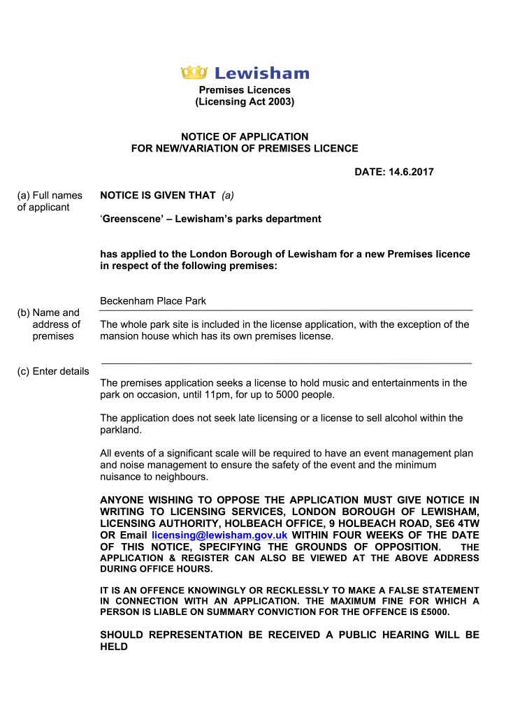 Lewisham Council are applying to themselves for a licence to hold music and entertainment events up to 2300 hours in Beckenham Place Park for 5,000 people.