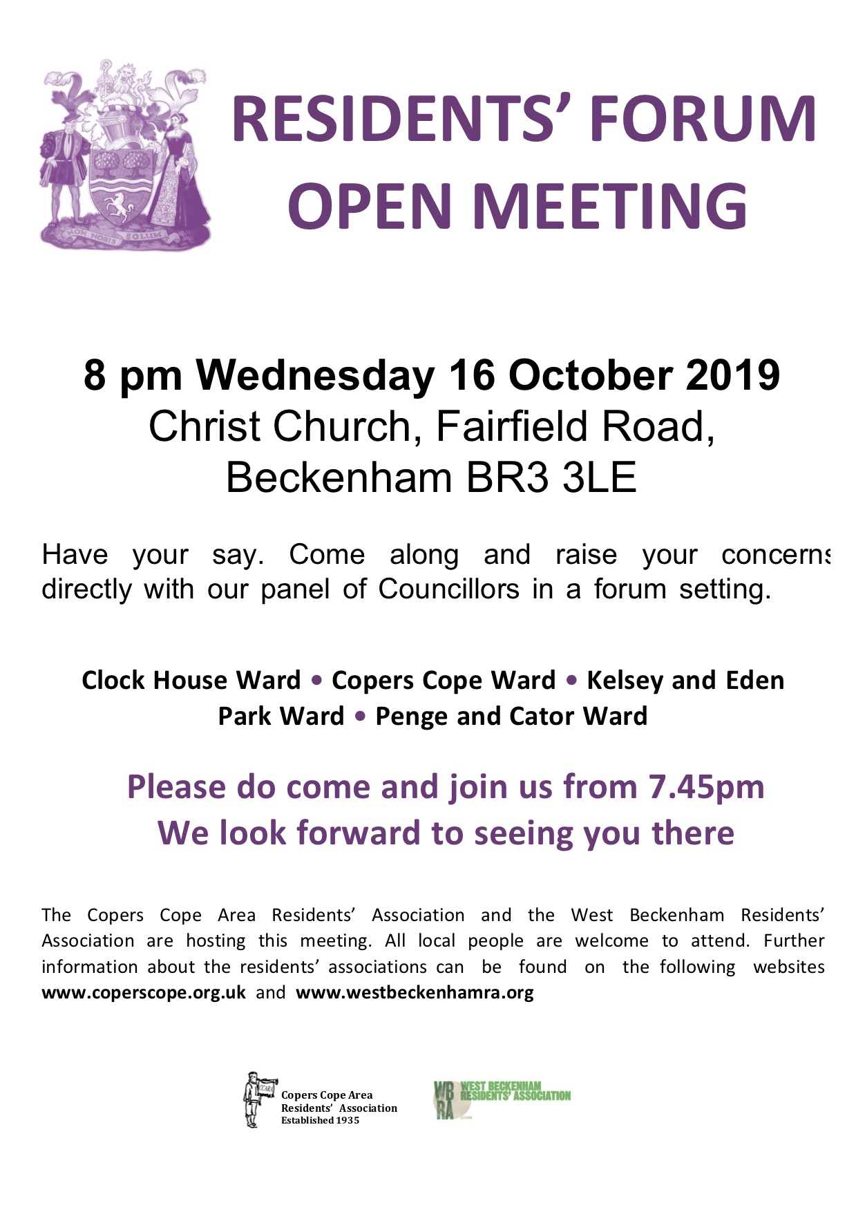 We are holding a public meeting open to all our members and Beckenham residents at 8pm on Wednesday 16 October 2019 at Christ Church, Fairfield Road, Beckenham BR3 3LE. Come along and raise your concerns with our panel of Councillors.