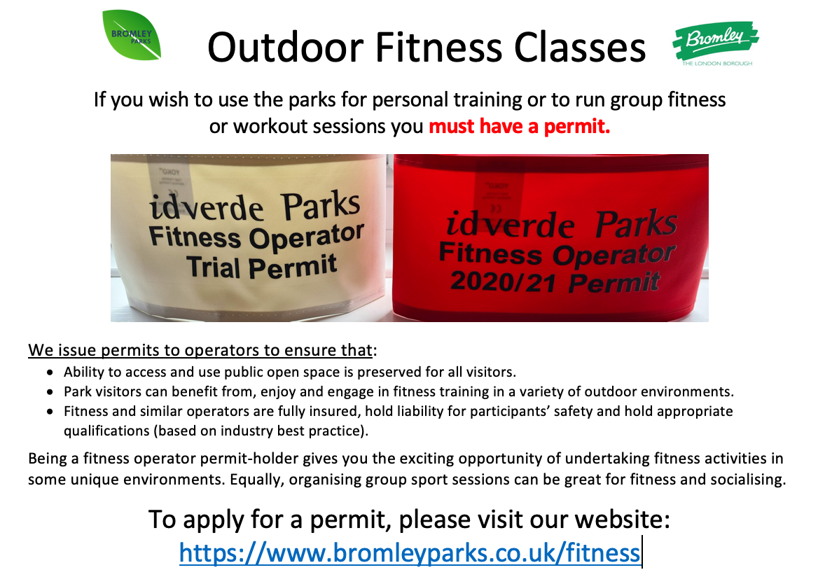 Residents may notice park-goers exercising whilst wearing red or white bands. Fitness providers running classes in Bromley Parks must now be registered and wear armbands displayed during an authorised fitness/training session.