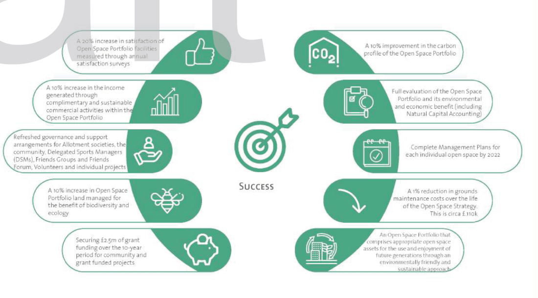 Page 5 has an infographic with small writing that refers to a “10% increase in income (complimentary and sustainable commercial activities)”; a “1% reduction in grounds maintenance costs” and unfortunately only a “10% increase in Open Space Portfolio land managed for the benefit of biodiversity and ecology” (hopefully not achieved by reducing the overall portfolio).