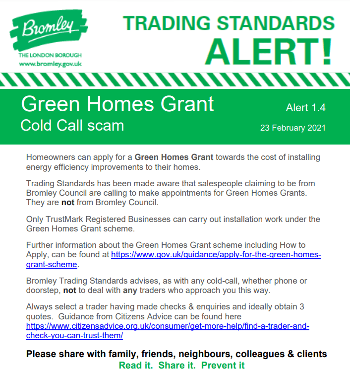 Homeowners can apply for a Green Homes Grant towards the cost of installing energy efficiency improvements to their homes. Trading Standards has been made aware that salespeople claiming to be from Bromley Council are calling to make appointments for Green Homes Grants. They are not from Bromley Council.