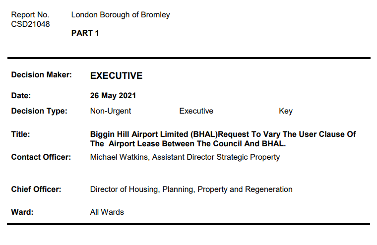 We have been advised by other Bromley Residents’ Association’s that Biggin Hill Airport have requested requested a variation to their lease with Bromley Council to allow “private flying including by accepting individual farepaying passengers”. Concerns have been raised that this change may increase air traffic, and in turn passenger traffic to the airport, and also that the current restictions on air movements of 50,000 a year set in 2016 was only for 5 years. Associated pollution and noise concerns have also been raised. The Council Executive are due to make a decision at a meeting on 26 May 2021. The formal proposal can be seen here and the meeting agenda here.