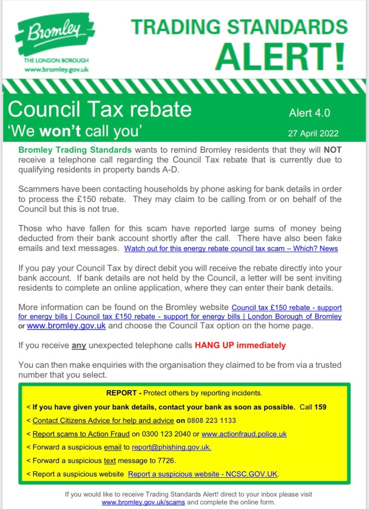 Bromley Trading Standards wants to remind Bromley residents that they will NOT receive a telephone call regarding the Council Tax rebate that is currently due to qualifying residents in property bands A-D.