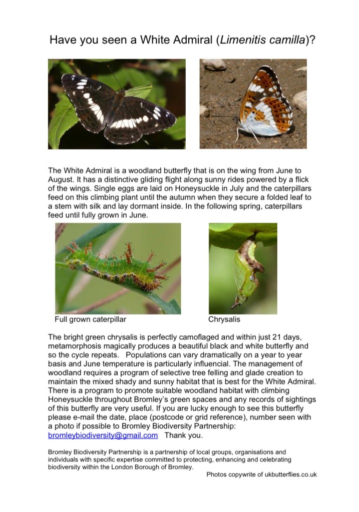 Bromley Biodiversity Partnership Species and Habitats are keen to find out about sightings of White Admiral butterflies across the Borough. Look out for them between June and September. If you spot one please let them know by email to bromleybiodiversity@gmail.com