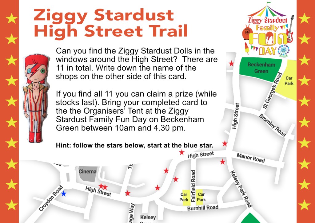 As part of the Ziggy Stardust Family Funday being held on Beckenham Green between 10am and 5pm on Saturday 1st July, we have a free kids Ziggy Stardust Trail in the High Street.