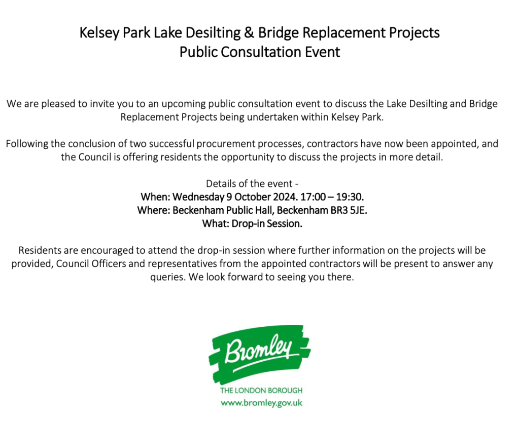 The Council are hosting a consultation event for the Kelsey Park Lake desilting project on Wednesday 9th October between 5pm and 7.30pm at Beckenham Public Halls.