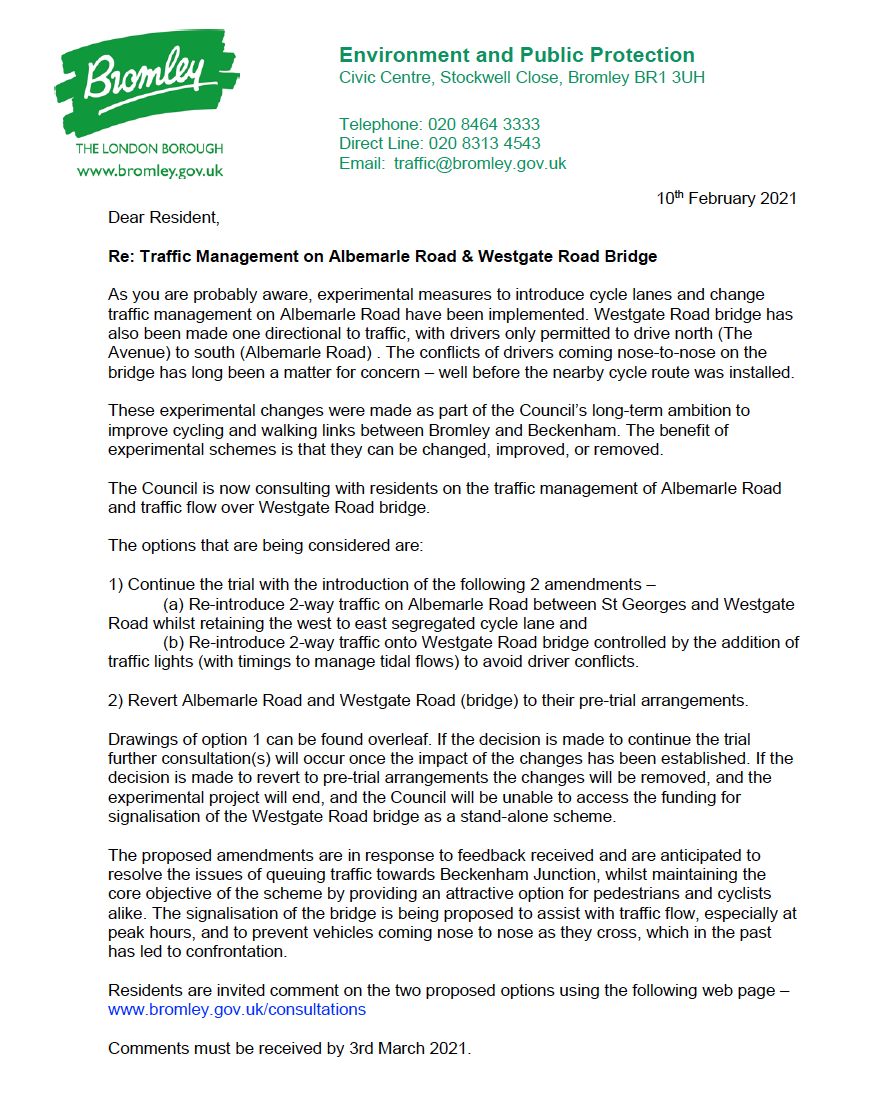 It is important to note that TfL will only fund the traffic lights on the bridge as part of a cycle route – if the Albemarle Rd cycle scheme is scrapped the traffic lights will not be provided.