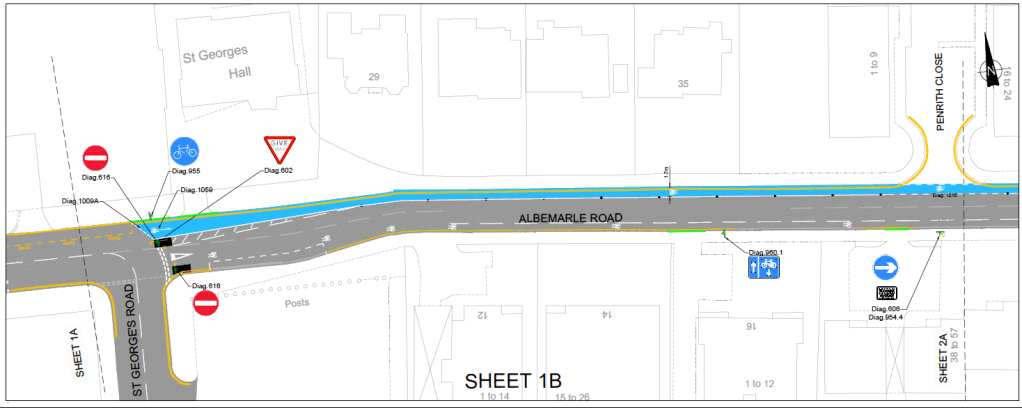 - As a cyclist, turning right into the cycle lane from St George’s Rd feels hazardous especially at peak times. One of our members felt vulnerable waiting on their bike in the middle of the new bend in the carriageway in order to turn right onto the new cycle lane on Albemarle Road.