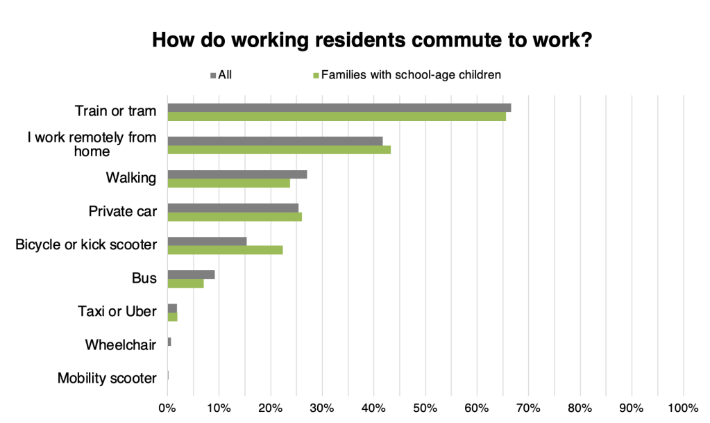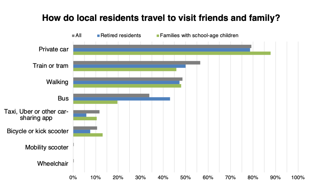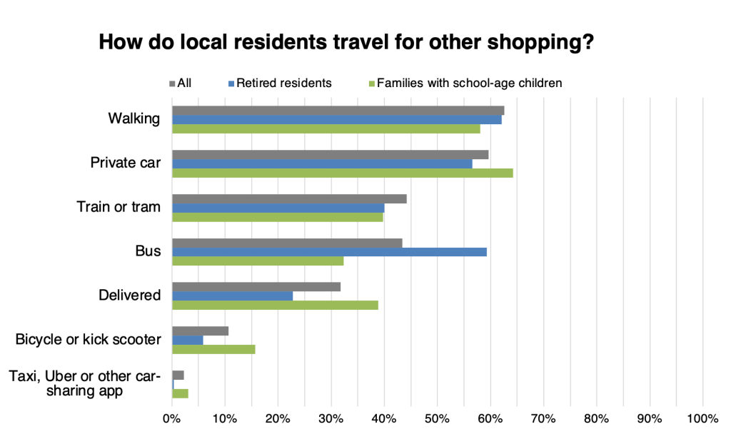 Responses to the question on how residents use Beckenham High Street showed that it is popular across a range of uses, making it possible for residents to stay local when doing their grocery shopping, going out for meals and going to public events. Families with school-age children are more likely to visit restaurants or cafes, or to visit parks, churches or local events, while retired residents are slightly more likely than average to access public transport.