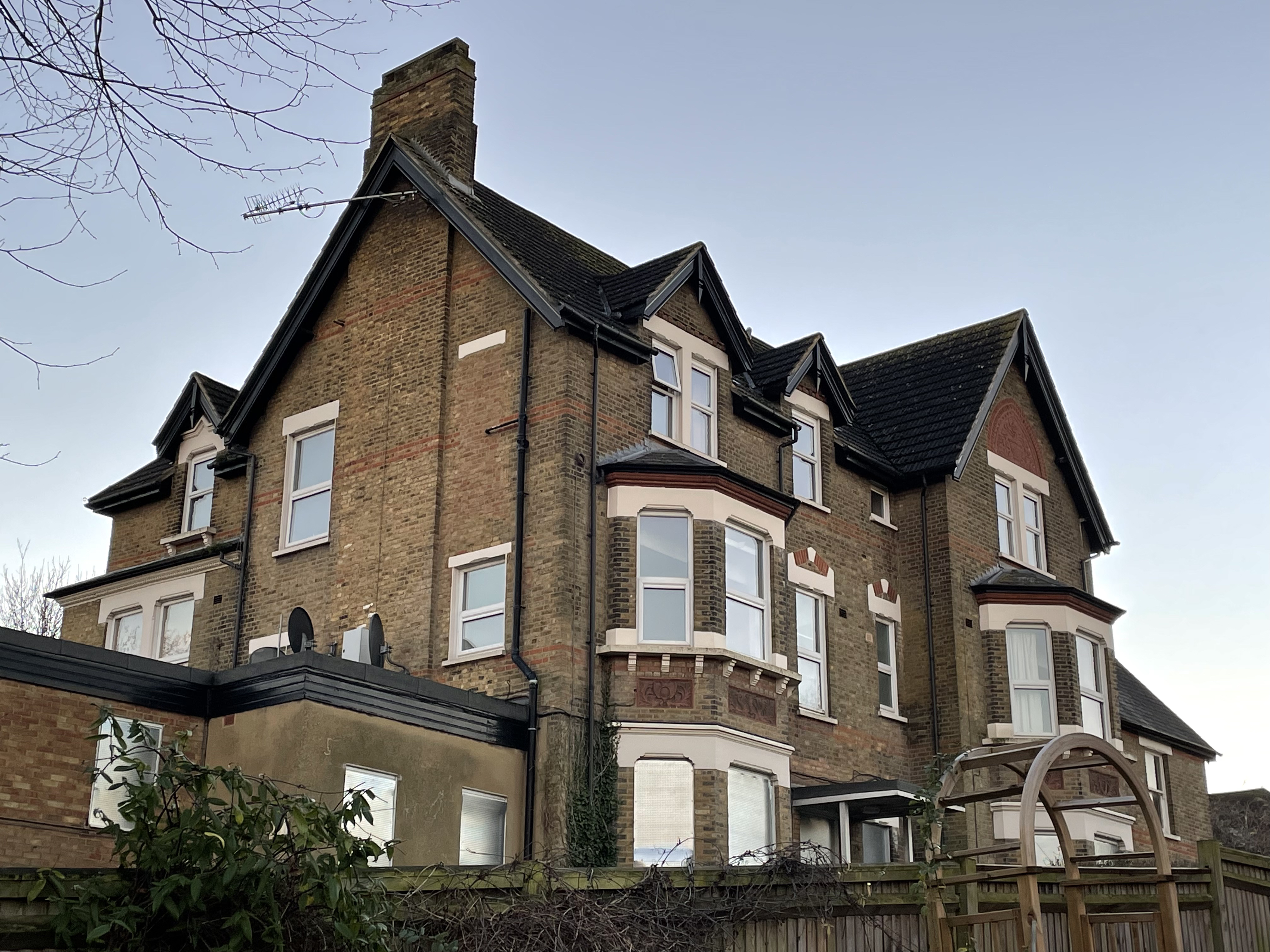 The house is currently hidden by scaffolding and sheeting but it is a fine and unaltered example of this kind of grand Victorian house located on a principal road in the Beckenham. The red brick front elevation, yellow London stock brick flank and rear walls, with carved stone lintels and insert panels, remain unpainted unlike its neighbours. It also retains its original timber sliding sash windows and decorated barge boards.